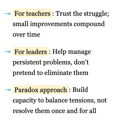 The paradox literature suggests a different approach entirely: recognizing that excellent teaching requires continuously balancing competing demands rather than resolving tensions once and for all. Leaders might stop asking teachers to choose between rigor and accessibility, between structure and flexibility, between content coverage and deep engagement—and instead help them develop the cognitive and emotional capabilities to hold these tensions simultaneously. This means protecting time for teachers to reflect and plan, creating structures for collegial exchange of practical wisdom, and reducing the organizational interruptions and constraints that make teaching harder than it needs to be. The wisdom isn’t in the reform program but in supporting teachers’ capacity to navigate classroom complexity with grace.