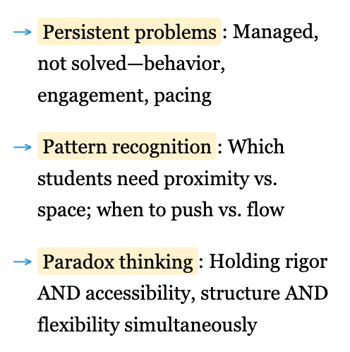 What looked like chaos was actually the invisible work of rebuilding. I was reestablishing routines, learning these particular students, calibrating my responses to their specific needs and patterns. Kennedy notes that teachers construct practices largely in isolation, dependent on students for evidence of success or failure. My fall was this painful recalibration—learning through daily failure what would and wouldn’t work with these students in this building at this moment. The struggle wasn’t wasted; it was the necessary foundation for what would come.