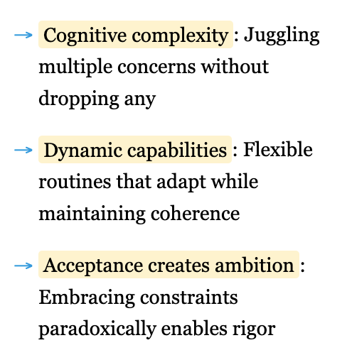 The paradox papers I’ve been reading help me understand this phase differently. Just as Chittick describes spiritual seekers accepting both divine mercy and severity, I was learning to accept both my teaching successes and failures as part of a larger pattern. Just as Smith and Lewis show that organizational sustainability requires continuously balancing competing demands rather than resolving them, I was learning to hold multiple teaching tensions simultaneously—rigor and accessibility, structure and flexibility, content coverage and deep engagement. Progress wasn’t linear but rhythmic, getting slightly better at the dance.