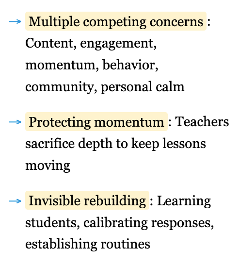 Kennedy’s analysis of classroom life helps me see this differently. She shows how teaching demands attention to far more than reformers typically acknowledge: not just content and engagement but also lesson momentum, classroom community, behavioral norms, and teachers’ own needs for order and calm. When these concerns conflict—as they constantly do—teachers instinctively protect momentum, sometimes at the cost of deeper learning. My fall semester was spent relearning this juggling act, rebuilding the tacit knowledge of how to keep all these balls in the air simultaneously.